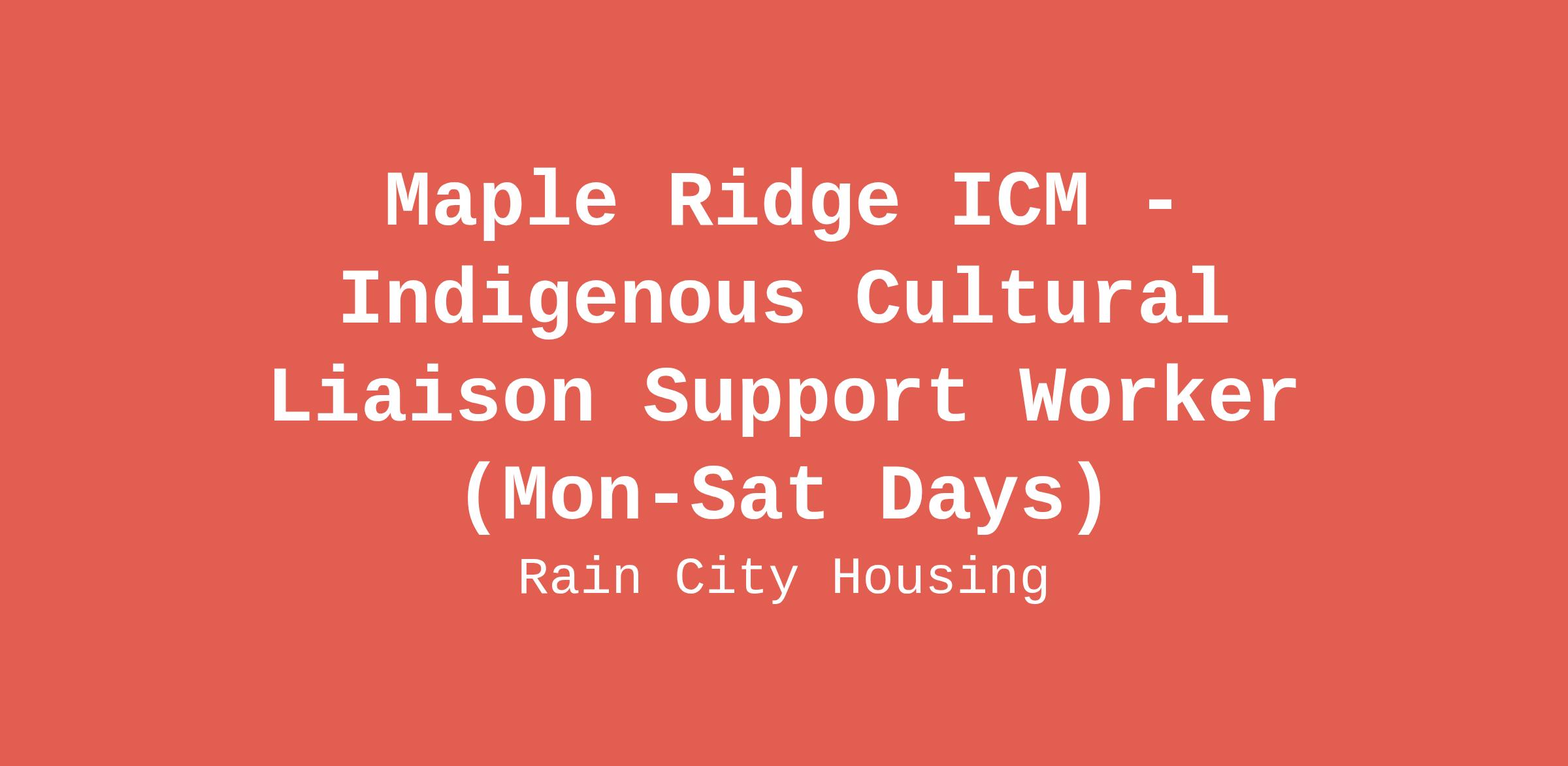 Job Competition #job2025.473Closing Date: Midnight January 27, 2026Job: Indigenous Cultural Liaison Support Worker, Maple Ridge ICM, Temporary until September 1, 2026 or until return of incumbent, Part-Time, 0.9 FTE Salary Range: $31.56-33.28 (BCGEU, Grid 34) Hours: 67.5 bi weekly Schedule: Week 1: Monday-Thursday 12:30pm - 8:30pm, Friday 8:30am - 4:30pm; Week 2: Tuesday-Thursday 8:30am - 4:30pm, Friday 12:30pm - 8:30pm; Week 3: Saturday-Sunday 8:30am - 4:30pm, Thursday 8:30am - 4:30pm, Friday 12:30pm - 8:30pm; Week 4: Saturday-Sunday 8:30am - 4:30pm, Wednesday-Friday 8:30am - 4:30pm; At present, includes 30-minute unpaid meal break Work Site: Maple Ridge, BC Start Date: As soon as possible