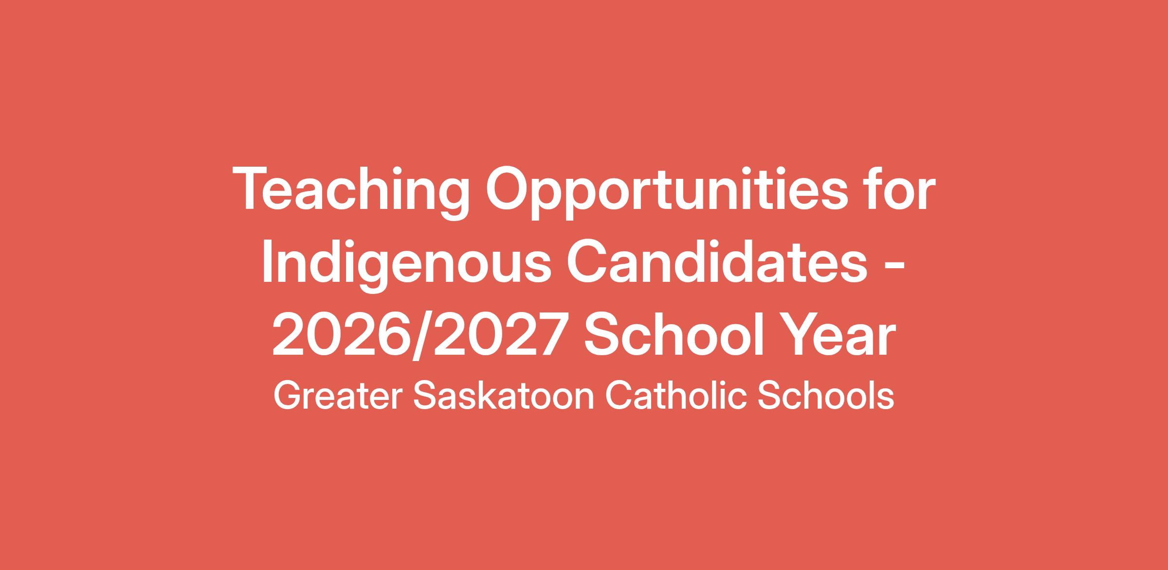 We are forever grateful to Indigenous educators, past and present, for their contributions to Greater Saskatoon Catholic Schools. A workforce that reflects and affirms the diversity of our school division is an integral contributor to quality and responsive Catholic education. We look forward to growing our team and wish to invite applications for full-time, continuing teaching opportunities, with duties to commence at the beginning of the 2026-2027 school year.