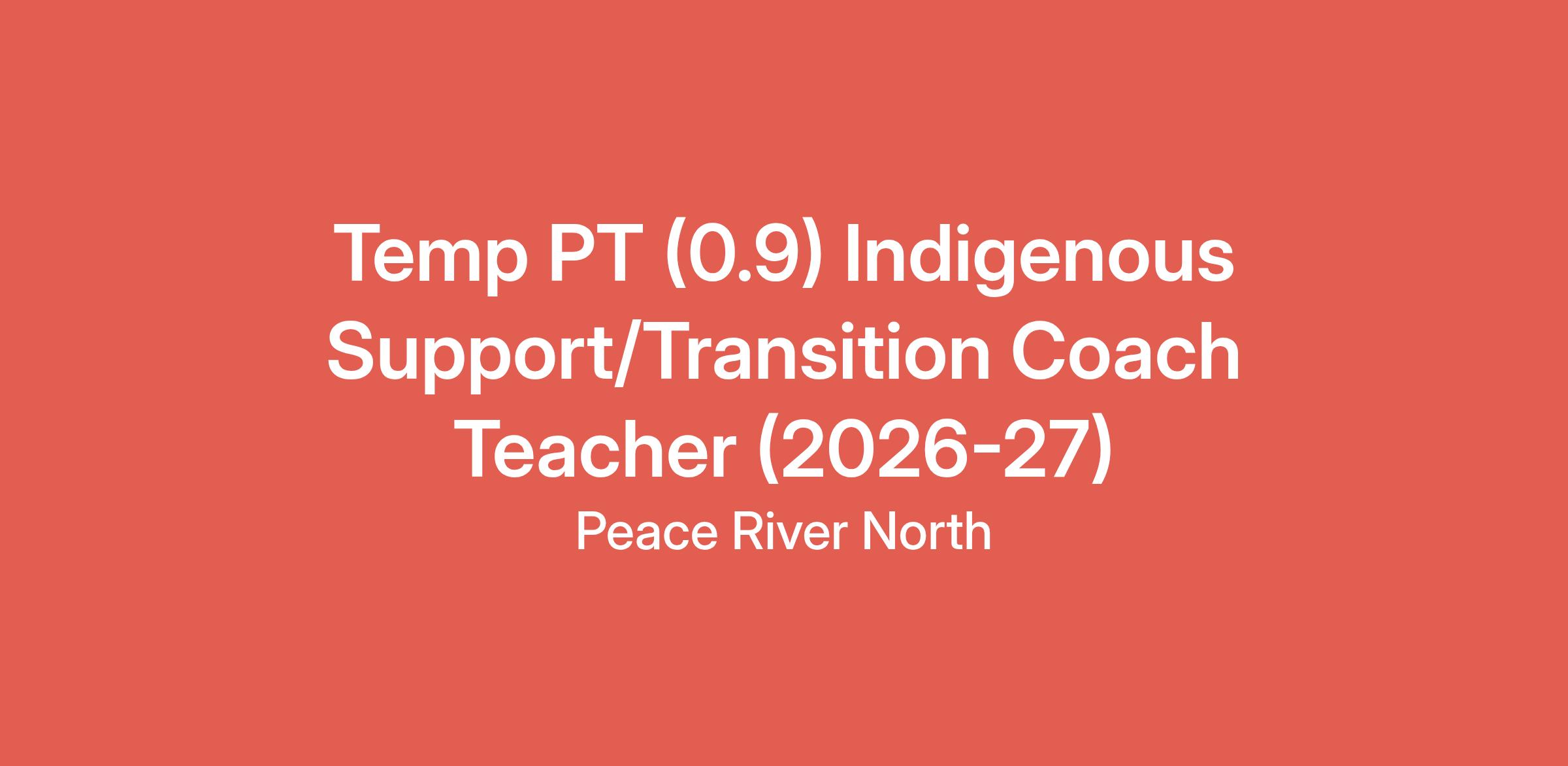 A temporary part time (0.9) Indigenous Support/Transition Coach Teacher is required by School District No. 60 (Peace River North) effective September 1, 2026 to June 30, 2027. The assignment will be at Dr. Kearney Middle School.